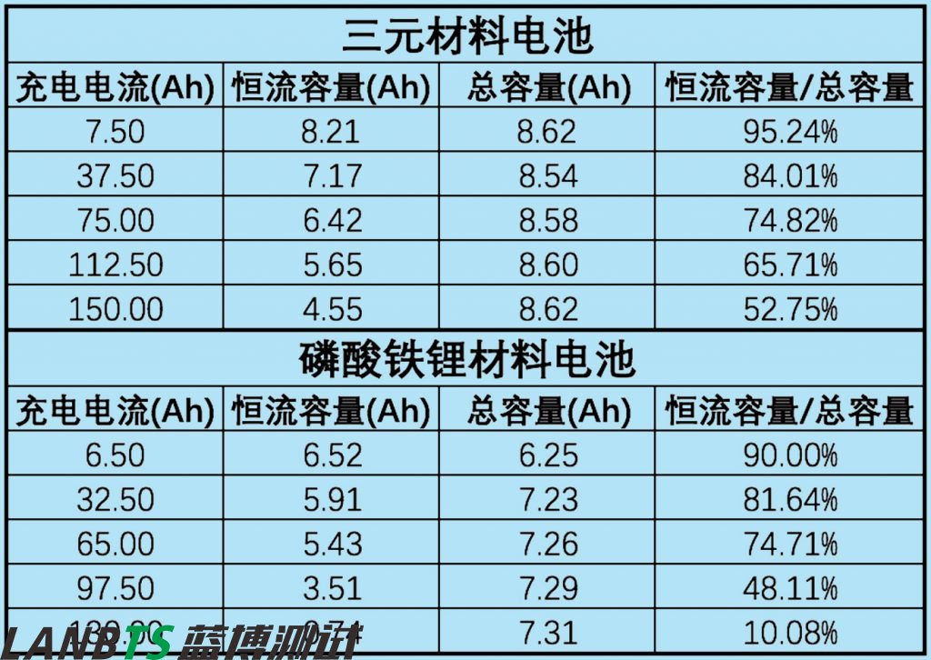 從表中可以看出,三元鋰電池與磷酸鐵鋰電池在10C以下充電時(shí),恒流比無明顯差距,10C以上倍率充電時(shí),磷酸鐵鋰電池恒流比例迅速降低,充電效率迅速降低。