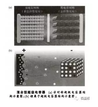 混合型超級(jí)電容器一般是指由不同類(lèi)型正負(fù)極電極材料組成的器件:一極是含贗電容電池材料,另一極是雙電層電容器材料。混合型臟電容器結(jié)合了雙電層材料的快速充放電和贗電容的高能m密度的特性,可同時(shí)具有高功率密度和高能量密度,彌補(bǔ)了在電池和超級(jí)電容器兩者不可兼得的空缺。